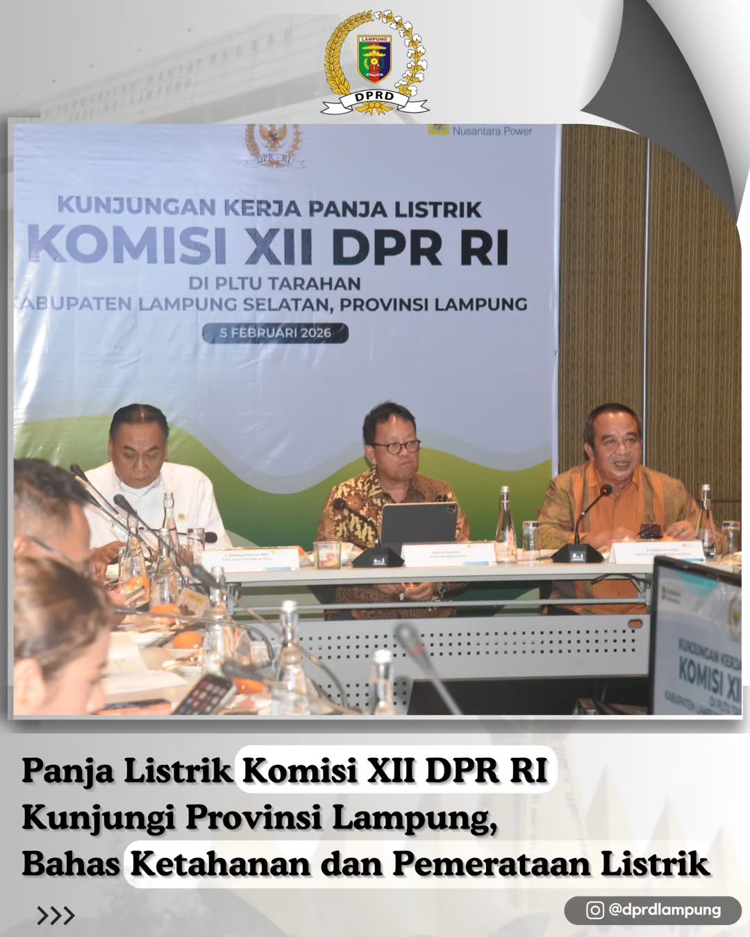 Panja Listrik Komisi XII DPR RI diterima oleh Pemerintah Provinsi Lampung yang diwakili Staf Ahli Gubernur Lampung Bidang Ekonomi, Keuangan, dan Pembangunan, Ir. Bani Ispriyanto, M.M., didampingi Sekretaris DPRD Provinsi Lampung Descataama Paksi Moeda, S.T., S.E., M.M., Kepala Dinas Energi dan Sumber Daya Mineral Provinsi Lampung Ir. Febrizal Levi Sukmana, S.T., M.T., M.M., Kepala Dinas Lingkungan Hidup Provinsi Lampung Riski Sofyan, S.STP., M.Si., serta Kepala Biro Pemerintahan dan Otonomi Daerah Provinsi Lampung Binarti Bintang, S.Sos., M.IP.