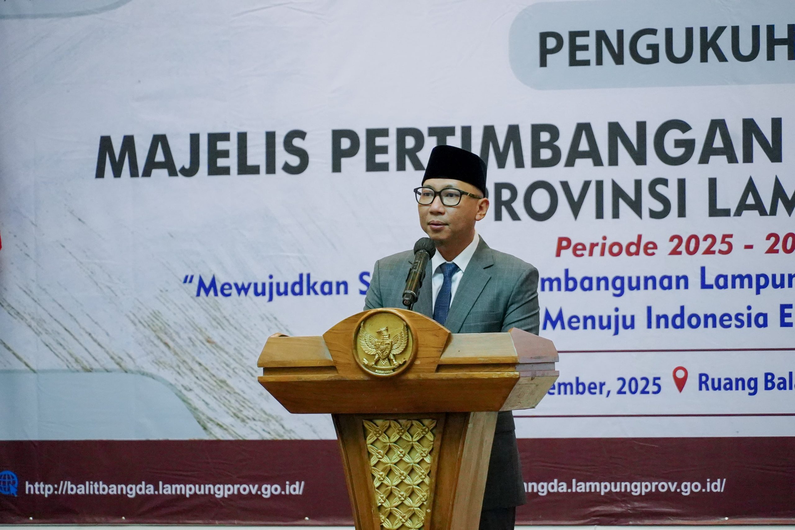 Bandar Lampung —- Gubernur Lampung, Rahmat Mirzani Djausal secara resmi mengukuhkan Majelis Pertimbangan Riset Daerah (MPRD) Provinsi Lampung periode 2025-2030, di Balai Keratun Lantai III, Kamis (6/11/2025).